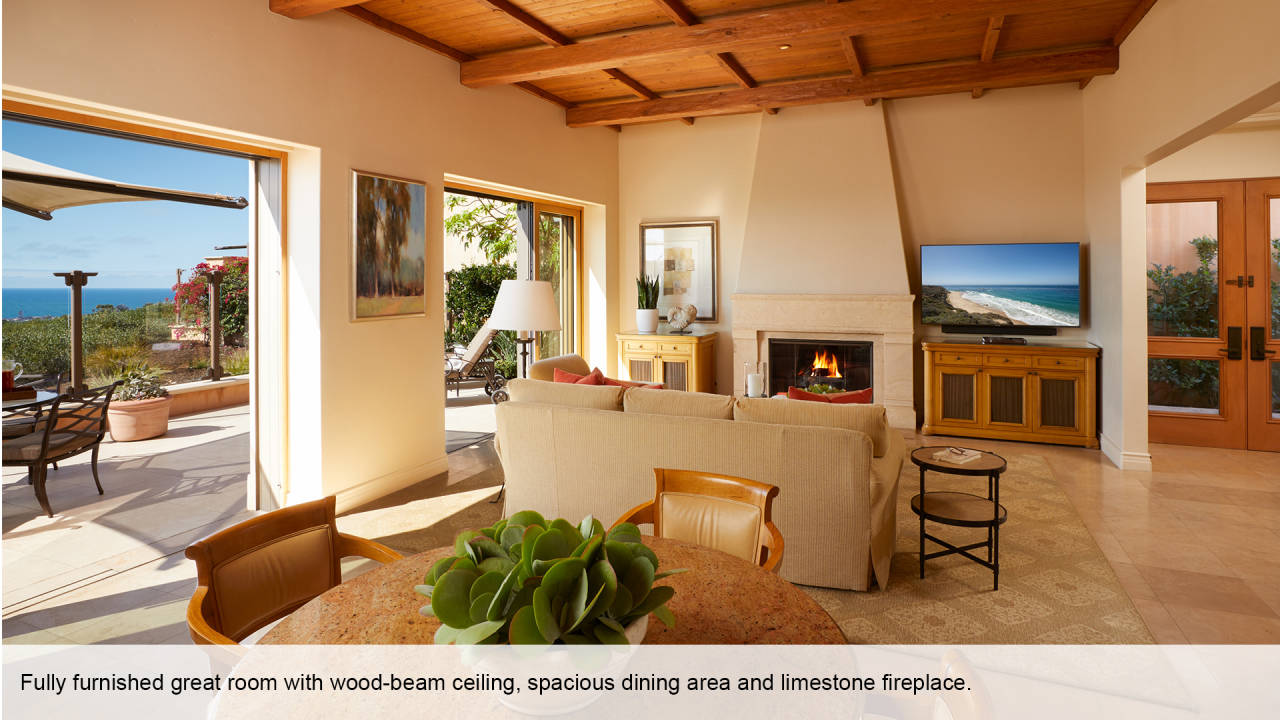 • Fully furnished great room with wood-beam ceiling, spacious dining area and limestone fireplace