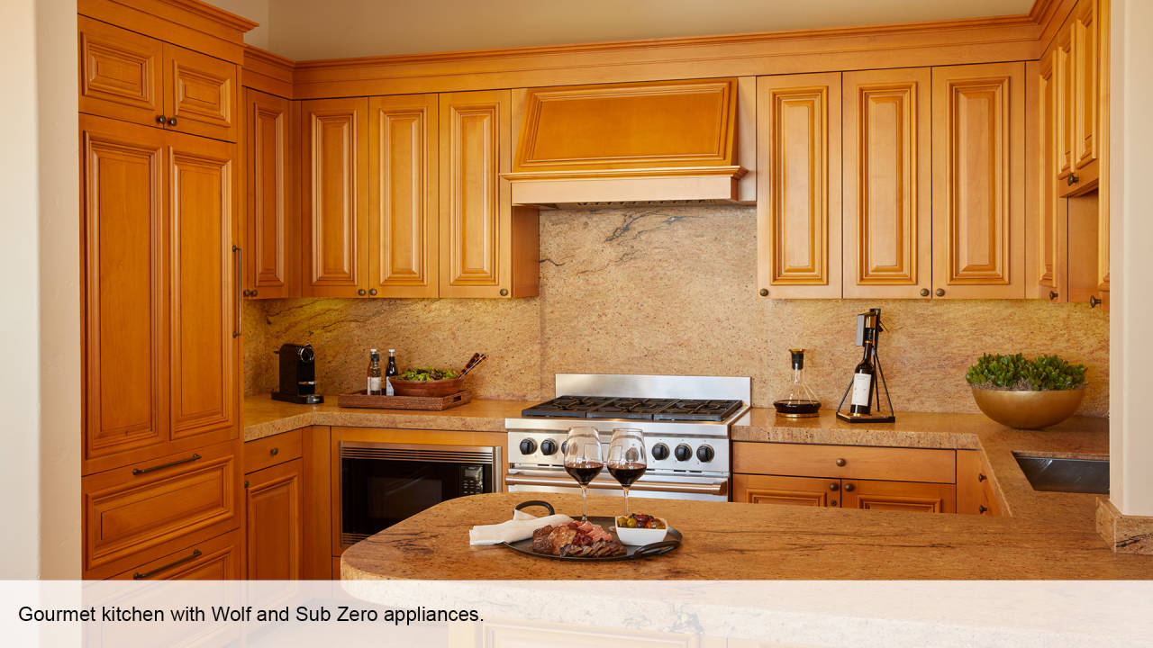 • Gourmet kitchen with Wolf appliances, Sub Zero refrigerator & wine cabinet, rich granite counter tops, fruit wood cabinetry, and essential cookware
