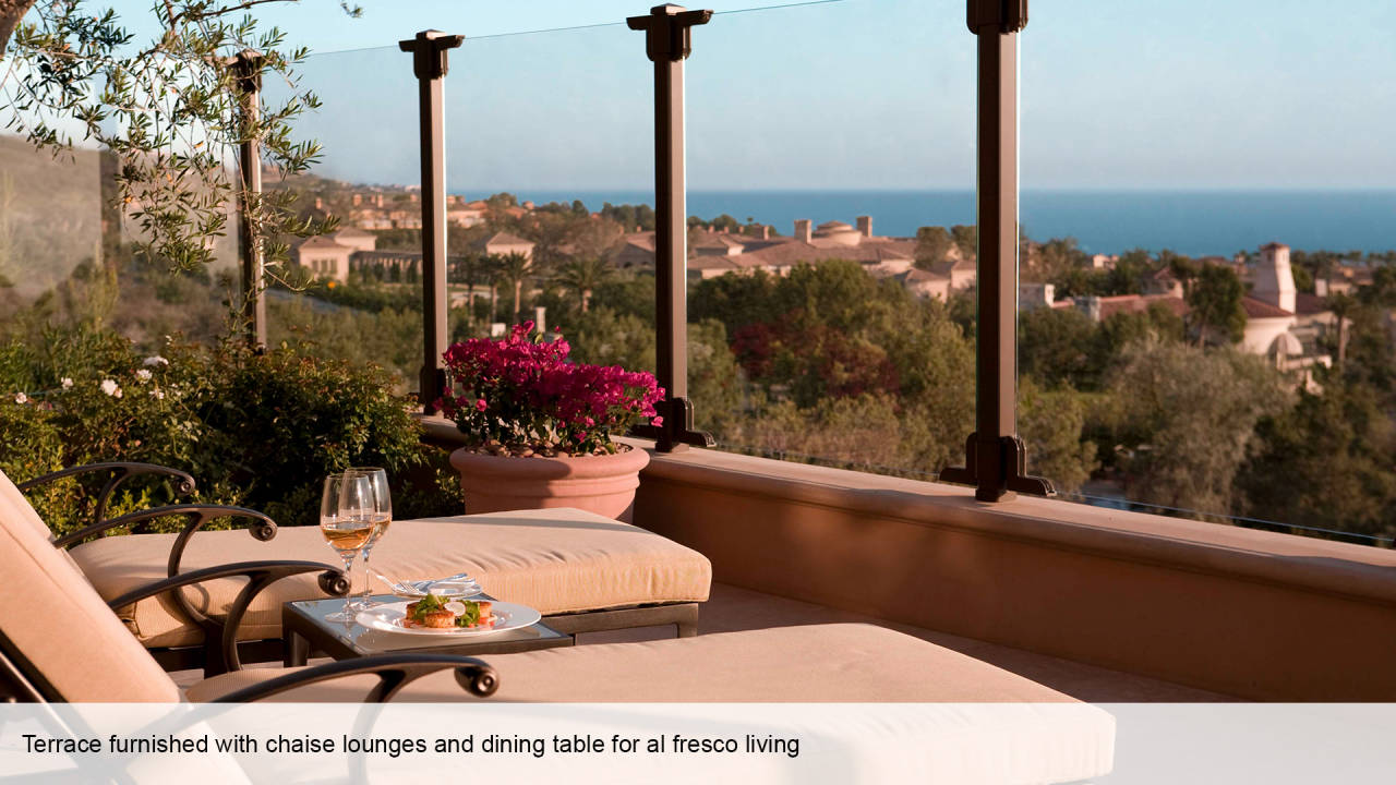 • Ocean-view private terrace furnished with chaise lounges and dining table