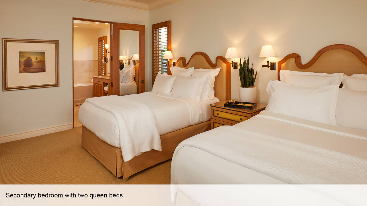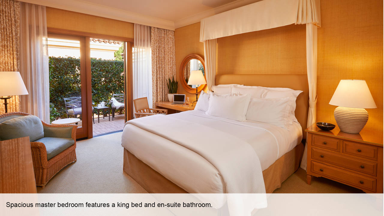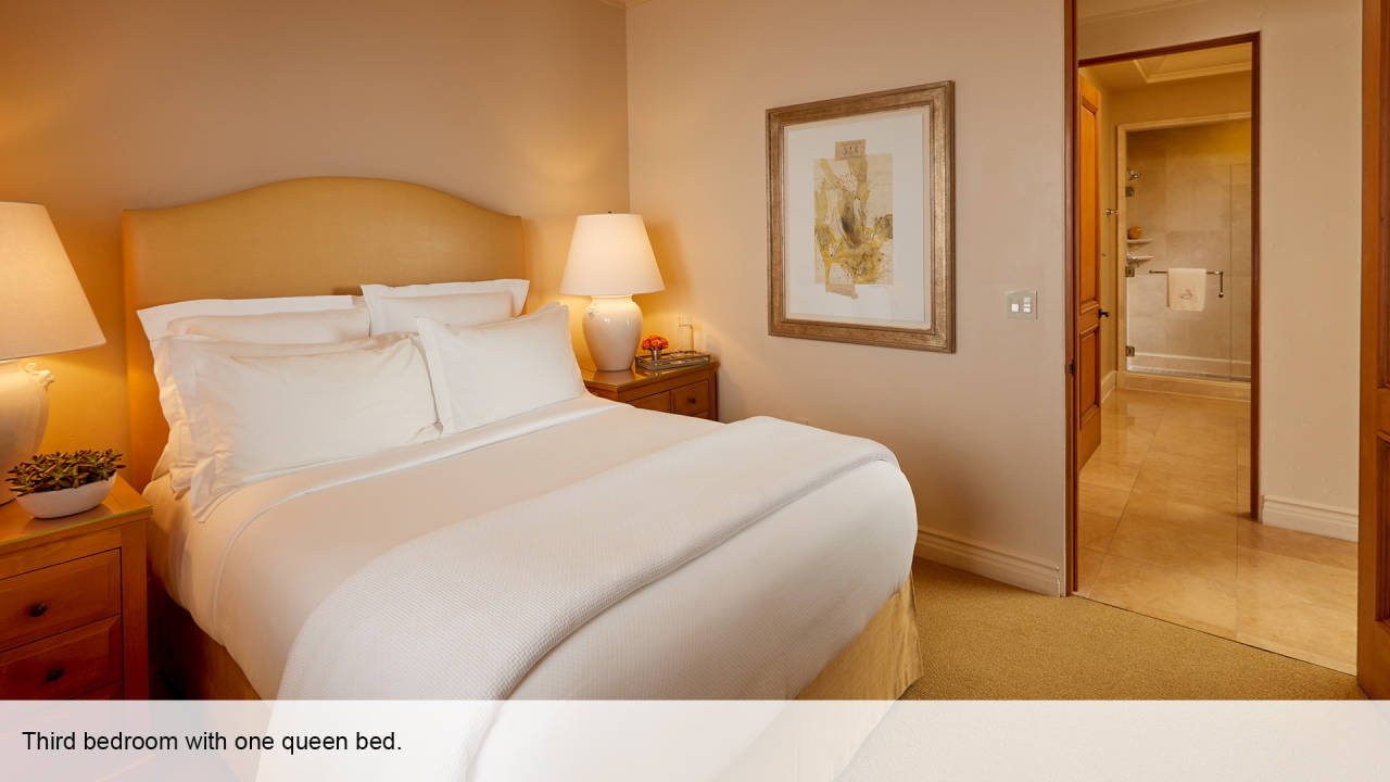The single-story three-bedroom residence offers all the rich details of a private home, but in a relaxed resort setting. The glass doors in the great room open up onto a generous, furnished terrace with sweeping views of the Pacific Ocean and championship golf courses. Artwork depicting the California landscape graces the interior, while finishes that are usually the exclusive domain of a custom home enhance your stay. An elegant master suite features a king bed with a spacious marble bathroom, a private patio and desk. Secondary bedrooms contain two queen beds and an additional third bedroom with one queen bed–all containing flat-screen TVs in each bedroom.