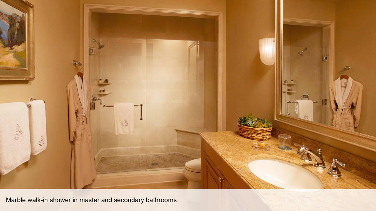 • Spacious master suite features private patio and en-suite bath with marble walk-in shower, deep soaking tub and double basins
